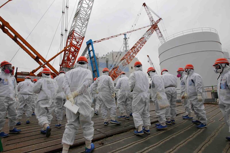 Nearly three years after Fukushima Daiichi nuclear power plant in Futaba, Japan was paralyzed by an earthquake and tsunami on March 11, 2011, triggering the world's worst nuclear crisis since Chernobyl, members of the media and Tokyo Electric Power Co. (TEPCO) wear protective suits and masks inside the No. 5 reactor building.