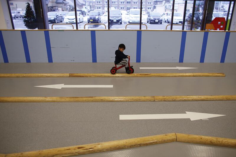 Four-year-old Iori Hiyama rides a tricycle at an indoor playground, which was built for children and parents who refrain from playing outside because of concerns about nuclear radiation in Koriyama.