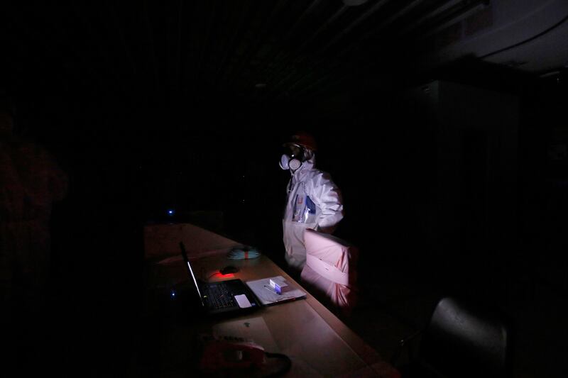 A TEPCO employee wears a protective suit and a mask during a blackout demonstration inside the central control room for the No. 1 and No. 2 reactors at the tsunami-crippled TEPCO Fukushima Daiichi nuclear power plant in Okuma.