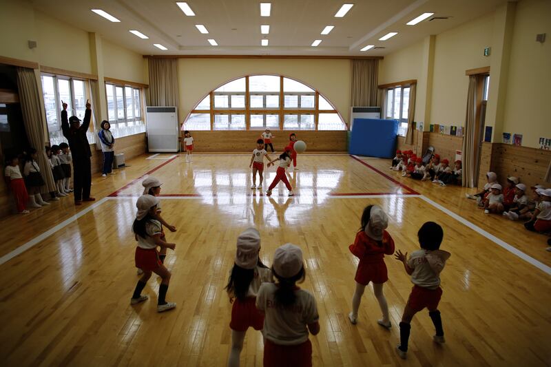 Children play dodge ball in a playroom at the Emporium kindergarten in Koriyama.