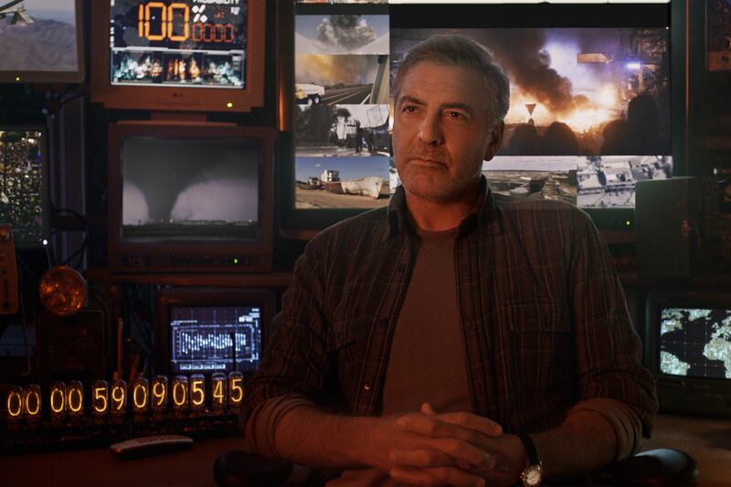 Decades later, now that Tomorrowland is all but defunct, his character is a crusty old man who passes his days staring at a bank of TV sets playing clips from 24-hour news stations detailing the disastrous state of our present: global warming, famine, wildfire, drought, climate change, endless war, endless disease.