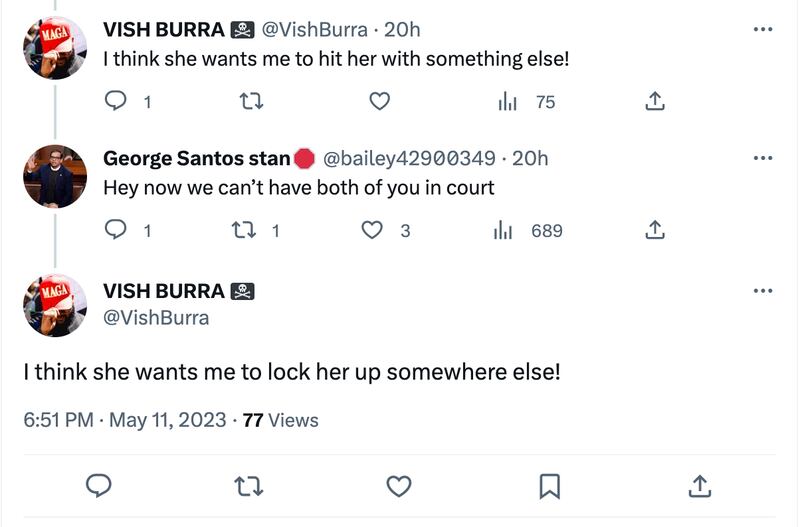 “The tweets of Vish Burra reflect the vulgar behavior that is becoming increasingly commonplace among Trump Republicans,” Holman said on Friday. “Trump first led the way for such behavior, and now many of his followers believe that vulgarity is acceptable politics as normal. George Santos’s staff are now joining Marjorie Taylor Greene, Lauren Boebert, and others’ disruptive behavior inside and outside the Halls of Congress. It is not illegal, but it shows a lack of respect for American political institutions specifically and American culture generally.”