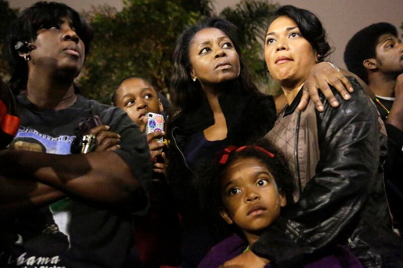 From left, Debra Reid; Yanni Medina, 13; her mother, Carol Medina; Blanca Zavala; and her daughter J'Len Edmund, 6, attend a rally in the Leimert Park neighborhood of Los Angeles following the verdict.