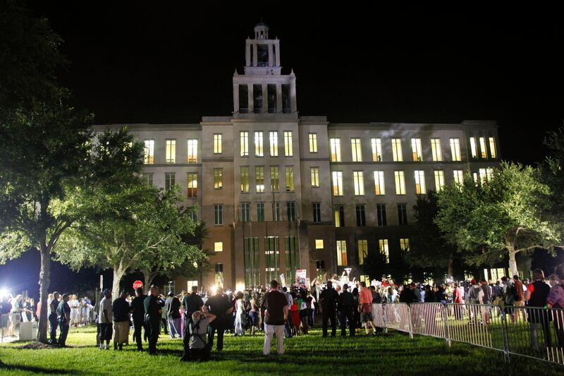 Demonstrators gather outside the Seminole County Courthouse after Zimmerman's not guilty verdict.
