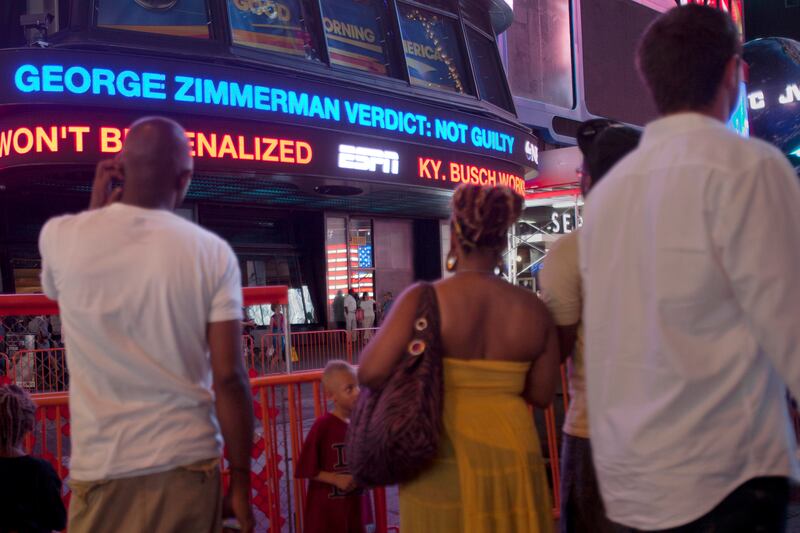 People watch a news ticker in Times Square deliver the news that George Zimmerman was found not guilty.
