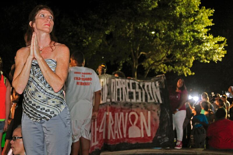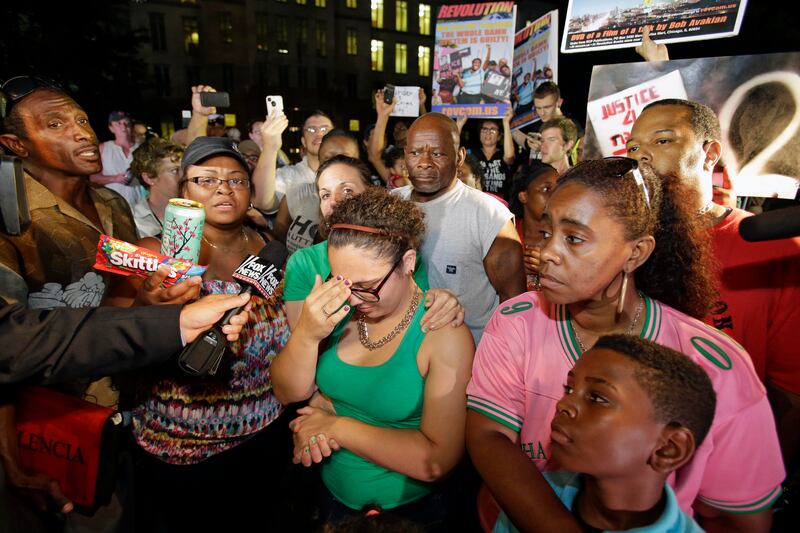 Darrsie Jackson (center) reacts Saturday after hearing the verdict of not guilty in the trial of George Zimmerman with her children Linzey Stafford (left), 10, and Shauntina Stafford, 11, at the Seminole County Courthouse. Zimmerman, 29, was charged with second-degree murder in the February 2012 shooting death of 17-year-old Trayvon Martin, who was unarmed at the time. A self-appointed neighborhood-watch volunteer, Zimmerman had claimed he was acting in self-defense.