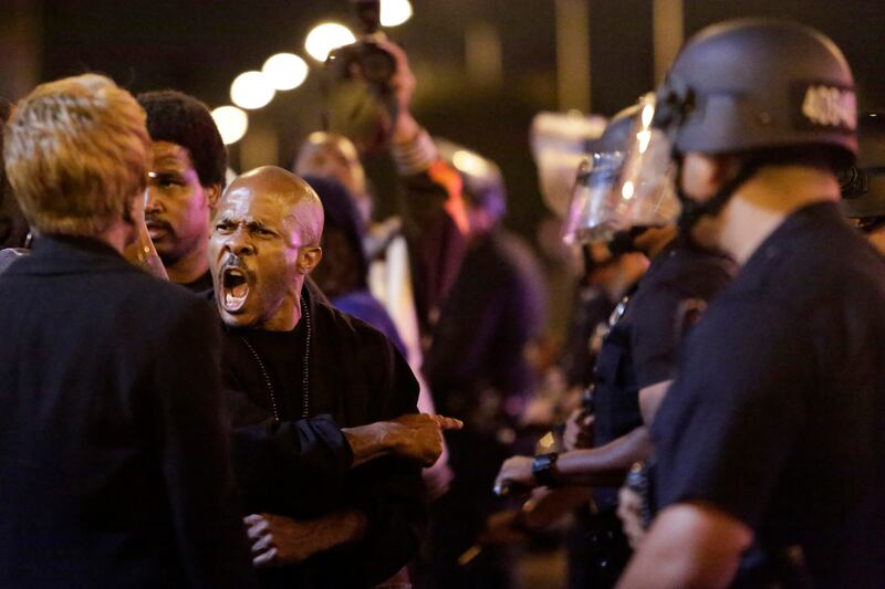 A protester shouts as Los Angeles police as they try to remove protesters from the intersection of Exposition and Crenshaw boulevards following the verdict.