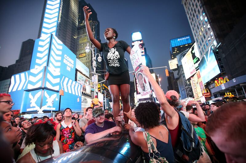 A man screams during a demonstration in Union Square in New York City after the news that George Zimmerman was found not guilty.