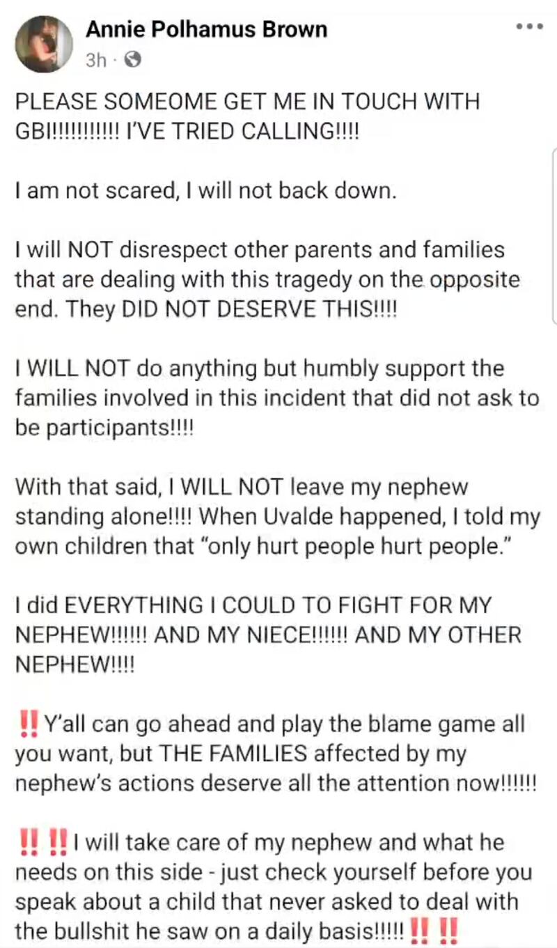 Facebook“With that said, I will not leave my nephew standing alone!!!!” Brown added. “When [the 2022] Uvalde [school shooting] happened, I told my own children that ‘only hurt people hurt people.’”