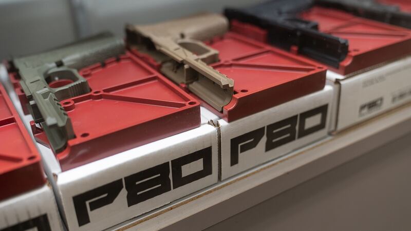 Polymer80 80% frames on sale at a store in California. So-called ghost guns can be assembled from kits and are not traceable by law enforcement because they lack serial numbers.
