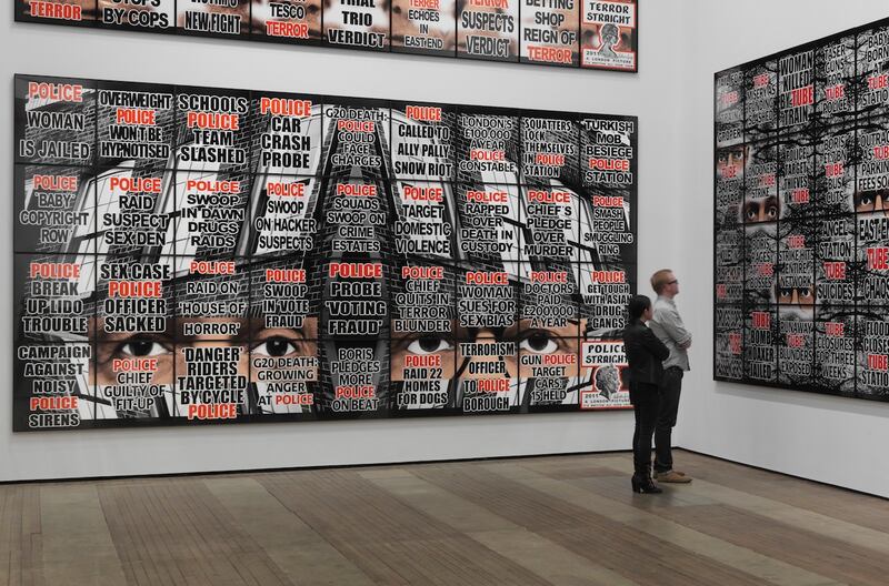 At their best, the great London art duo Gilbert and George have a note of poignancy in their work – very notable in early pieces from the 1960s, less so as they've become superstars. That note is back again, in complicated ways, in a giant new series of works called the London Pictures, filling both of Lehmann Maupin's New York spaces, as well as all Sonnabend Gallery. The premise behind the project is simple: Over the last six years or so, G&G have collected 3,712 daily posters from British newspaper boxes, and have now organized them in grids according to the words they contain. Thirty-five headlines including the word "Police" might appear in frames on one wall; fifteen "Stabbed To Deaths" might be on another. The poignancy? It doesn't just lie in the banal violence of the urban subject matter. It's also in the fact that the entire genre of headlines the duo have captured is sure to disappear, one of these decades. Google demands headlines that are more informative than grabby.