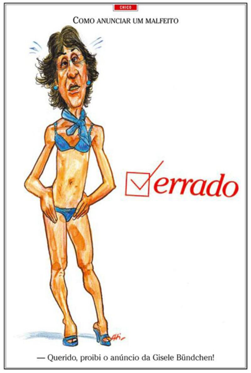 The Brazilian media, meanwhile, feasted. Chico Caruso, a cartoonist for the Rio daily O Globo, drew the bespectacled minister in a Hope bikini. Sergio Augusto, Brazil’s foremost cultural columnist, skewered the tone-deaf government’s attempt to trample irony in the name of the “feministically correct,” while one netizen blogged about the keepers of the state trying to “annex the human body.”