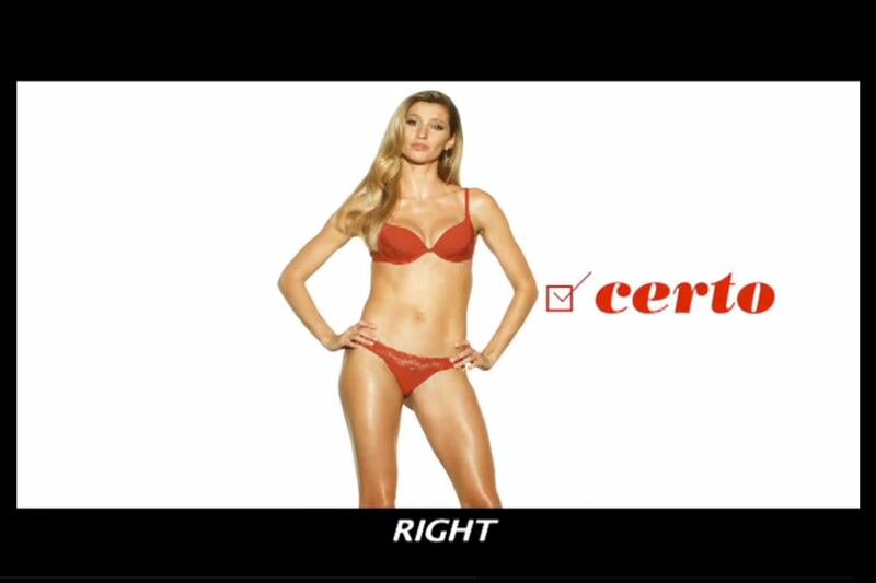 The ad, a familiar Brazilian blend of sensuality and sassy good fun, casts Bündchen as a fashionista, teaching women how—and how not—to break bad news to a husband. In one scene, a penitent missus in a shapeless tube dress scratches her head and admits to having crashed the car. In take two, labeled “right,” the camera closes on a leggy temptress with hands akimbo and in battle gear—matching Hope red panties and bra—who confesses the same crime. “Again,” she says.