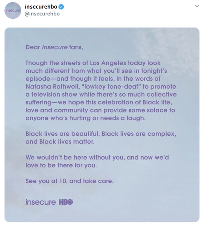 “Though the streets of Los Angeles today look much different from what you’ll see in tonight’s episode—and though it feels, in the words of Natasha Rothwell, “lowkey tone-deaf” to promote a television show when there’s so much collective suffering—we hope this celebration of Black life, love, and community can provide some solace to anyone hurting or needs a laugh.”