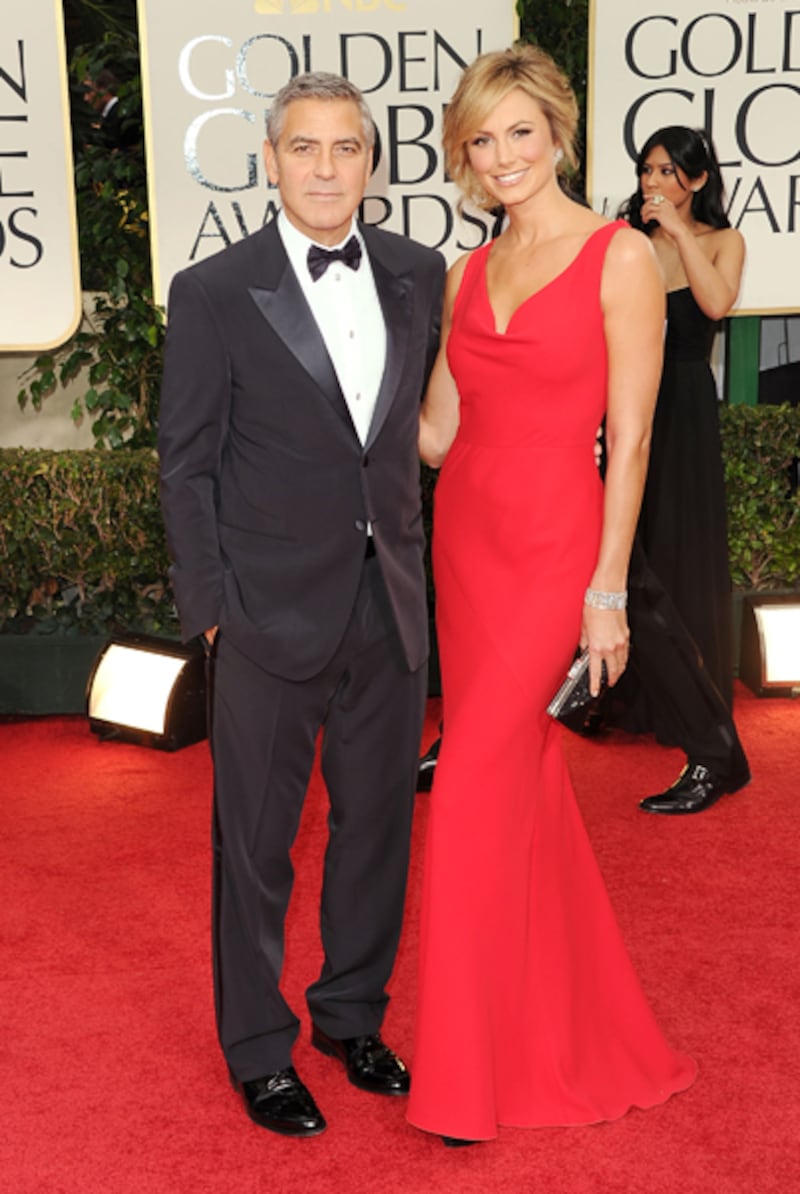 George Clooney, nominated for four Golden Globes, told Ryan Seacrest: “I’m probably going to be a pretty big loser tonight. That’s my sense.” Clooney, in a classic Giorgio Armani tux, was joined by his girlfriend, Stacy Keibler, who wore a red silk crepe Valentino gown with a bow-black detail.