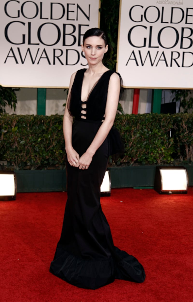 “I’m a little nervous because I’ve never been here before,” said Mara, who was nominated for Best Actress for her role in The Girl With the Dragon Tattoo. Mara looked sleek in a black silk faille gown with bow ribbon detail from Nina Ricci’s Pre-Fall 2012 collection. “I liked it because it was comfortable and simple,” she said.