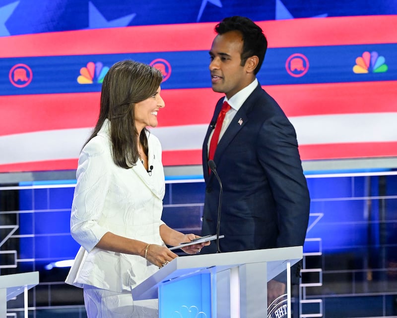 Nikki Haley and Vivek Ramaswamy at the Republican presidential debate on Nov. 8, 2023.