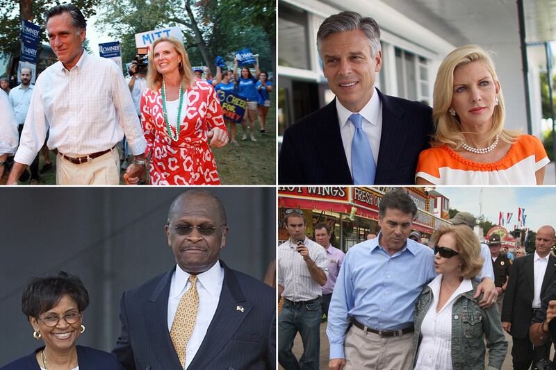 Who are the seven wives and one husband behind the Republican 2012 hopefuls? Anita Perry, Mary Kaye Huntsman, and Ann Romney have loudly supported their husbands’ candidacies. Karen Garver Santorum is a bestselling author. Callista Gingrich and Marcus Bachmann have been controversial in their own right, while Gloria Cain and Carol Paul have been hardly visible. As the GOP race gets tighter and frontrunners emerge, see photos of the candidates’ helpmates.