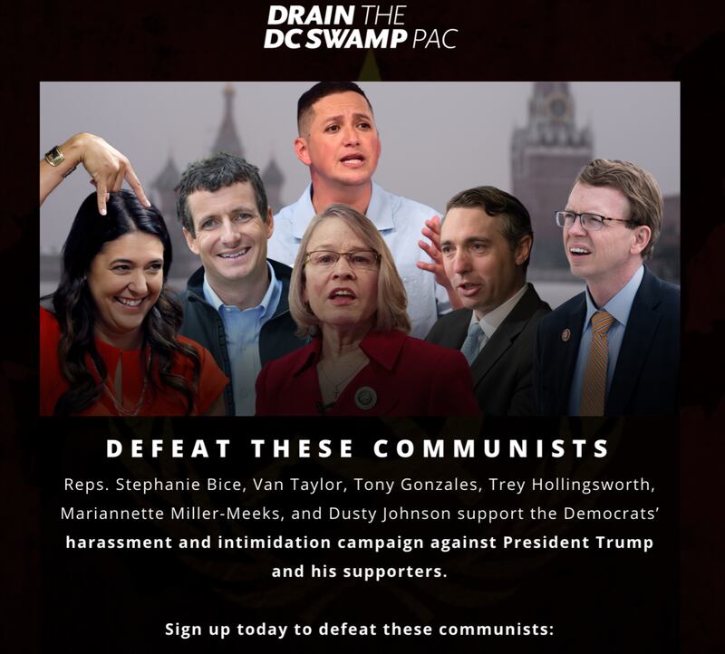 In about $300,000 worth of recent ads, the group—Drain the DC Swamp PAC—has painted these Republicans as “turncoats” and “RINO communist traitors.” And the treasonous act for these Republicans—many of whom have been loyal foot soldiers for Donald Trump for years, so much so that some even objected to the election results—was simply voting for a bipartisan Jan. 6 commission.