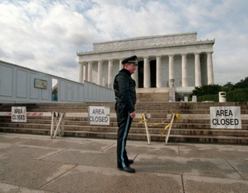 U.S. Park Service Police Officer P.G. Carroll stood in front of a closed Lincoln Memorial in 1995, during the partial shutdown of the federal government. (AP Photo),CHARLES TASNADI