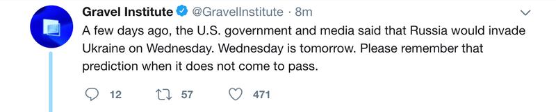 The next day, in another since-disappeared tweet, it wrote: “A few days ago, the U.S. government and media said that Russia would invade Ukraine on Wednesday. Wednesday is tomorrow. Please remember that prediction when it does not come to pass.”
