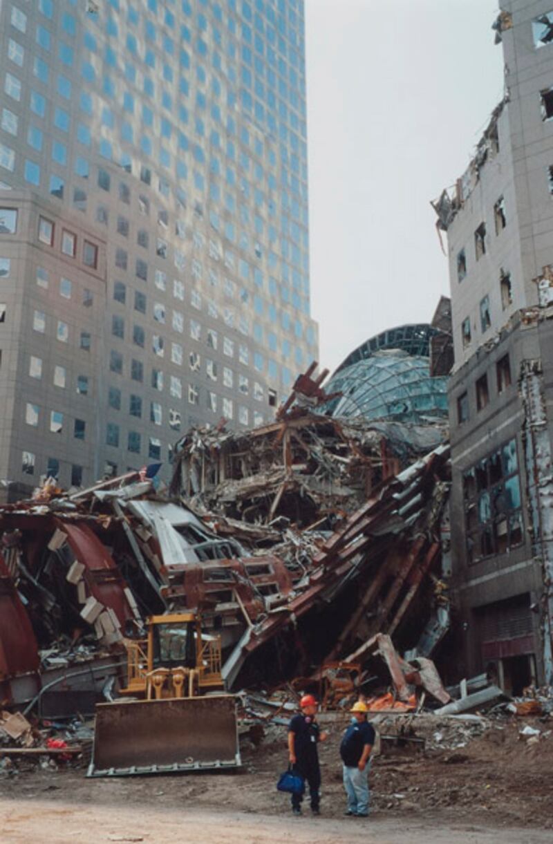 “This happens to be on the first day I was on Ground Zero–it was Sept. 23. This was taken standing near the Winter Garden–there had been a bridge from the Winter Garden to the World Trade Center, and behind the workers in this shot is that collapsed bridge. Having my first glimpse of the enormity of destruction, everything was of interest to me. Every day was a race against the clock, to capture as much of the damage as I could before they took it all away.”