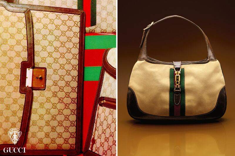 Around this time, the GG logo is applied to canvas and used for bags, small leather goods, luggage, and the first pieces of clothing, including the Jackie bag (at right).