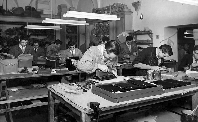 Production of leather goods resumes after World War II. Aldo Gucci introduces the pigskin, which becomes a signature house material following the war. The first bamboo-handled bag, inspired by the shape of a saddle, is thought to have been produced in this period.