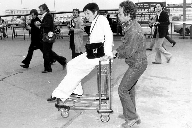 Liza Minnelli takes a spin on a shopping cart pushed by Joel Grey.