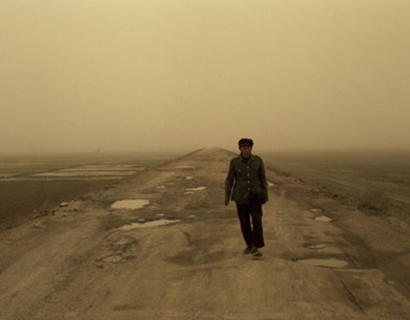 The annual trips Hai Bo makes from Beijing to his hometown, Changchun, in the Jilin province in northern China, have led to several bodies of photographs. In his current large-scale color work, lone figures appear in context of that region’s vast, empty landscapes. One image, Passing Traveler, 2008, has no visual cues to place it in time: The landscape is barren; the overall amber light might just as easily be sepia-toning from the 19th century as air pollution in industrialized China today; the figure in the center of the frame could be a soldier or a factory worker, but his clothes do not place him in any specific period in recent Chinese history. The combination of the season and the time of day in which Hai Bo chose to photograph render a mythic timelessness to these pictures of local residents making their way on a long empty road across the desolate countryside. “One can say that [these photographs] are elegies for the vanishing agricultural society of China,” Hai Bo has said about this work.