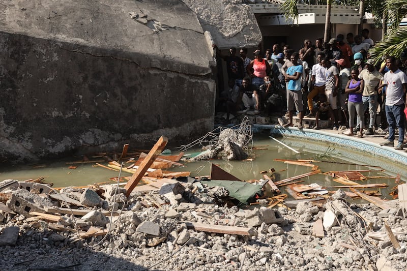 Locals gather to inspect the destroyed main hotel of Les Cayes.