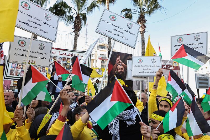 Fatah supporters lift flags and banners during a rally marking the 59th anniversary of the movement in Ramallah.