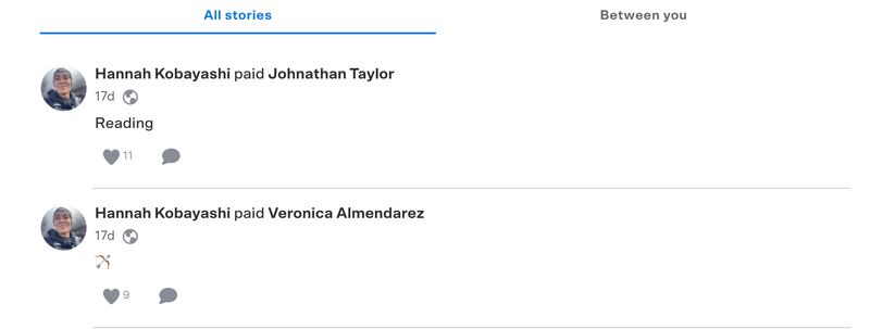 Those payments—for unknown amounts—were sent to a Jonathan Taylor and a Veronica Almendarez within an hour of each other, her account shows. Her payment to Almendarez included a note with a bow and arrow emoji for her payment, while she labeled her payment to Taylor simply “reading.”