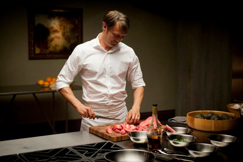 In this series, form mirrors content: immense care is taken to showcase Hannibal Lecter as a man who takes immense care of everything in his life. This ranges from the elaborately prepared gourmet meals he serves Will and Will’s boss, Lawrence Fishburne’s FBI guy Jack Crawford, to Lecter’s exceedingly neat office (in Hannibal, he’s a psychiatrist who engages everyone he encounters in would-be brain-buster dialogues, especially with willful, wonky Will), to his meticulously executed murders. (Fuller can detail a scene so vividly, you just know the socks in which Hannibal glides across a carpet to surprise a victim must be made of cashmere.) This character has become a pop-culture fixture—whether played by Brian Cox in Michael Mann’s 1986 Manhunter, Anthony Hopkins in Jonathan Demme’s 1991 Silence of the Lambs, or now Mikkelsen—in no small part due to his depiction as a purringly articulate, cultured psychopath, and Fuller cranks up the classical music on the soundtrack as his Hannibal serves up courses of liver or tongue.