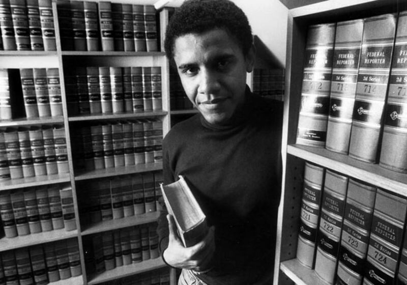 In February 1990, the then-law student poses in the office of The Harvard Law Review at Harvard University in Cambridge, after being named president of The Harvard Law Review.