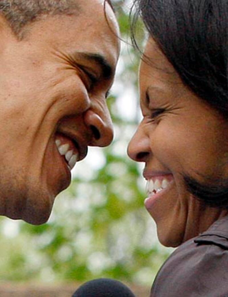 In May 2008, the then-senator shares a moment with wife Michelle on the campaign trail at a Hamilton County family picnic in Noblesville, Indiana.
