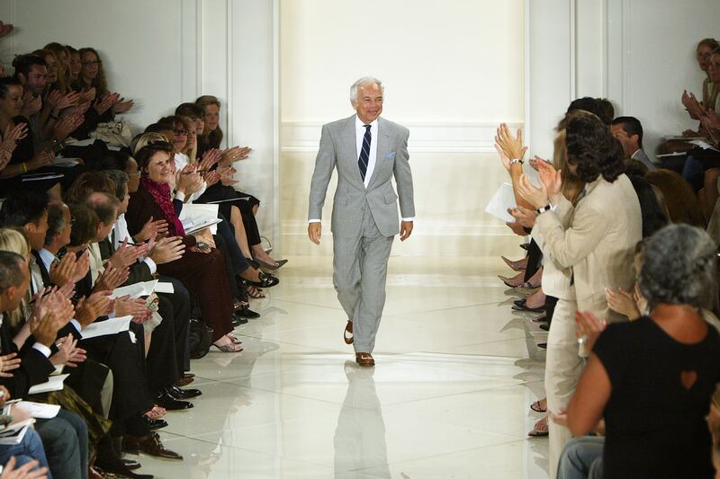 Following his Spring 2005 show in New York, Ralph Lauren takes his runway bow in an elegant gray suit.