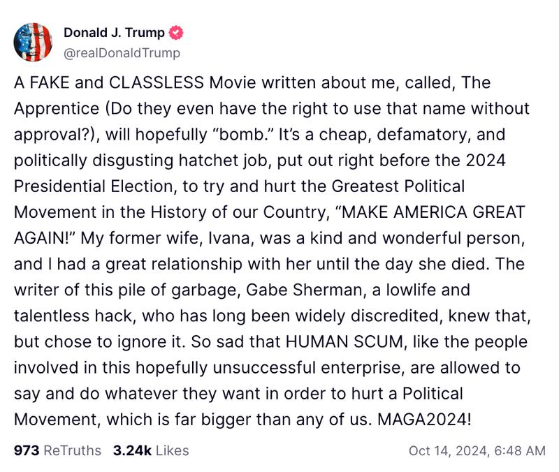 Former president Donald Trump has called the newly released biopic focused on his early business career “a politically disgusting hatchet job” that he claimed is the work of “HUMAN SCUM.”