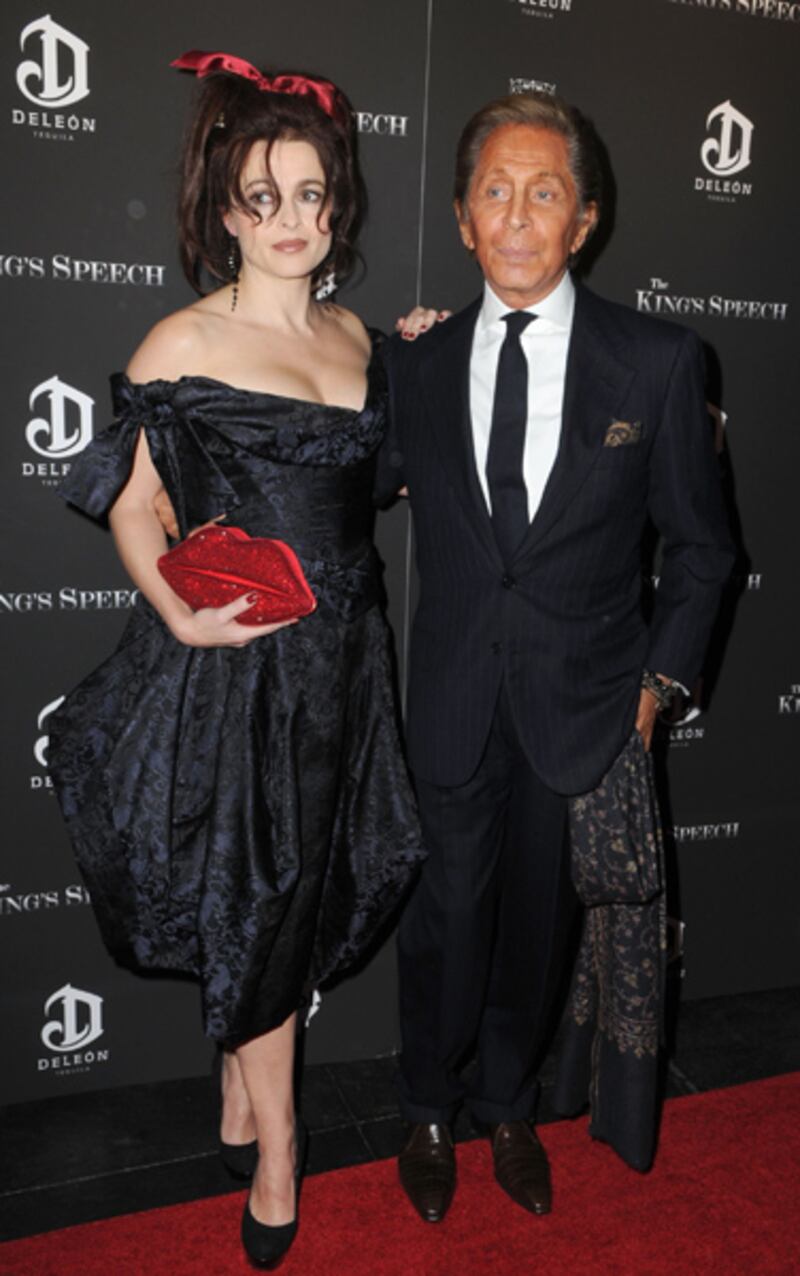 Posing with Valentino Garavani at the premiere of The King’s Speech in New York City on November 8, 2010. She chose a black Vivienne Westwood gown for the occasion, and wore a red bow in her hair.