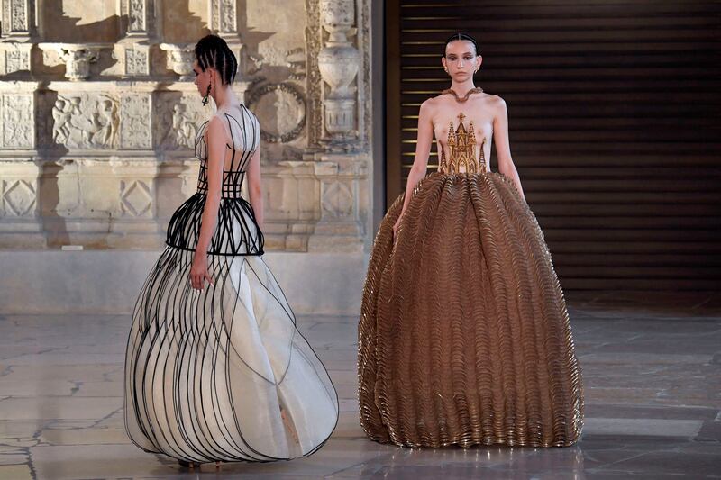 Models present creations by Guo Pei during the 2018-2019 Fall/Winter Haute Couture collection fashion show in Paris, on July 4, 2018.