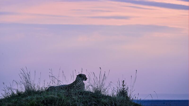 A young Cheetah male rests on a mound at dusk after feeding on the carcass of a Topi antelope that his coalition of four brothers managed to hunt and bring down on the plains of the Masai Mara National Reserve where the spectacular annual migration of Wildebesst into Kenya from Tanzania is started on July 16, 2020.