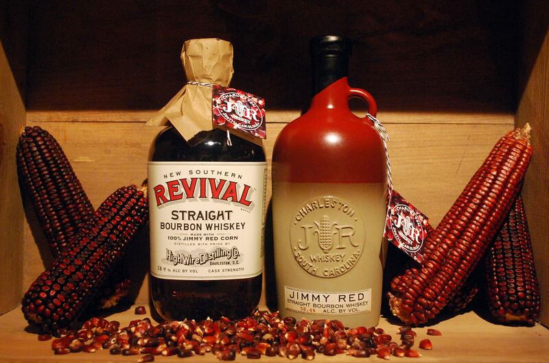 New Southern Revival Straight Bourbon from High Wire Distillery in Charleston, South Carolina, is made from a mash consisting only of Jimmy Red Corn. It’s an old hooch corn, with beautiful, ragged runs of kernels that vary from fire orange to a deep, purplish red. It’s named after James Island, South Carolina, where it was grown for decades and almost drifted off into extinction.