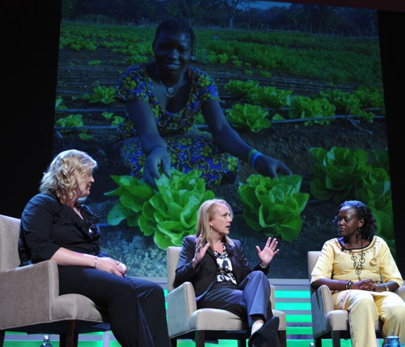 Jocelyn Wyatt, Social Innovation Lead, IDEO, Pam Darwin, Vice President, Geoscience, ExxonMobil Production Company and Eva Walusimbi, Solar Sister, ExxonMobil partner and Ashoka's Changemaker on the 'Women | Tools | Technology: A Global Leapfrog' panel at the 2011 Women in the World Summit.