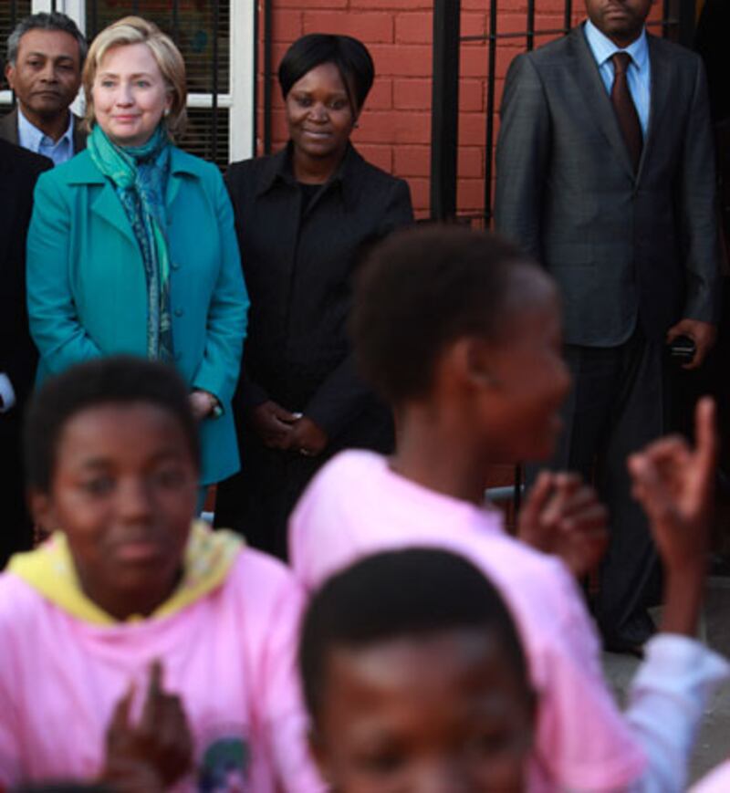 Hillary Clinton is seen during a visit at a housing project in Khayelitsha, on the outskirts of Cape Town, South Africa, on August 8. On a mission to improve ties with Africa's most prosperous nation, she met Saturday with South African President Jacob Zuma and later toured a housing project she had visited twice in the past.