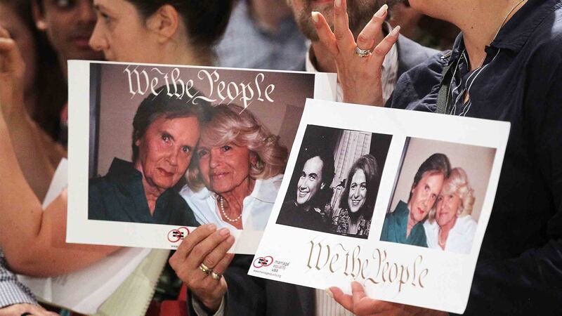 Supporters of Defense of Marriage Act (DOMA) plaintiff Edith 'Edie' Windsor wait for her to enter a press conference in Manhattan following the U.S. Supreme Court ruling on DOMA on June 26, 2013 in New York City. It was the death of Windsor's life partner of 42 years, Thea Clara Spyer, which led to the case. The high court struck down the Defense of Marriage Act (DOMA) and ruled that supporters of California's ban on gay marriage, Proposition 8, could not defend it before the Supreme Court.