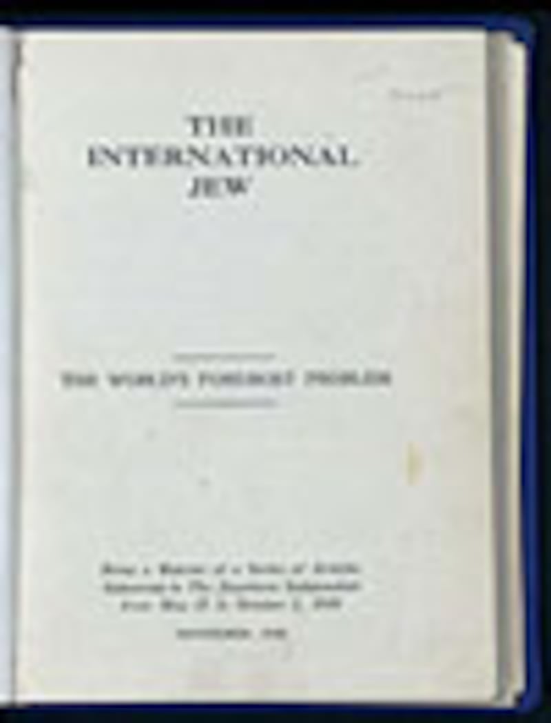 In 1923, a New York Times correspondent reported that Hitler had stacks of Ford's ant-Semitic treatise The International Jew: The World's Foremost Problem, originally published in the Dearborn Independent, on a table in the foyer outside his Munich office and a portrait of the American industrialist on his wall. Hitler called Ford his “inspiration” and included The International Jew on a short list of books titled, “Books that every National Socialist should read.”