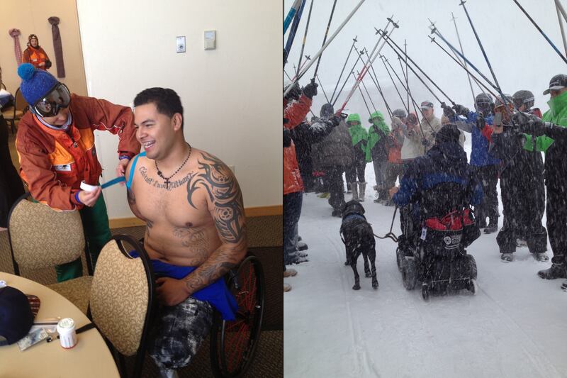 California native Corporal Jorge Elizio Salazar lost both legs in Kajaki, Afghanistan in August 2012, when a buried bomb detonated beneath him. “I remember everything,” said the father of two. “I’ve never been on snow before. This is the best kind of therapy, not like a vacation.” A member of the Marine Corps’ Wounded Warrior Olympics Team, he swims the 50-meter free, 100-meter free, and 50-meter back. He plays on the volleyball and basketball teams, and just started surfing.