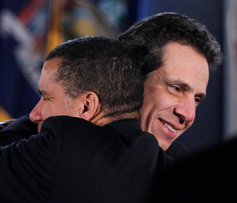 "New York's Governor Andrew Cuomo (R) hugs outgoing Governor David Paterson during a swearing-in ceremony at the Capitol in Albany, New York January 1, 2011. REUTERS/Mike Groll/Pool (UNITED STATES - Tags: POLITICS IMAGES OF THE DAY)"