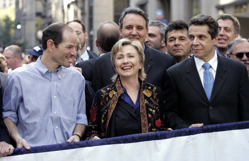 "Senator Hillary Clinton (C) smiles with New York Democratic candidate for attorney general Andrew Cuomo (R) and New York Democratic gubernatorial candidate Eliot Spitzer during the Columbus Day parade in New York October 9, 2006. REUTERS/Shannon Stapleton (UNITED STATES)"