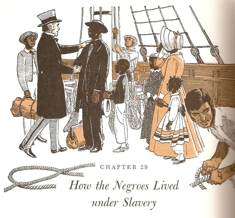 The effort made by the UDC to control history textbooks paid off immeasurably and continued to shape how Americans remembered the Civil War well into the 20th century. As late as the ’70s, the state of Virginia still used the popular textbook Virginia: History, Government, Geography by Francis B. Simkins, Spotswood H. Jones, and Sidman P. Poole, first published in 1957. Its chapter on slavery—“How the Negroes Lived under Slavery”—featured a well-dressed African-American family on board a ship shaking hands with a white man, who is presumed to be the family’s new owner. Here is how it describes slavery: